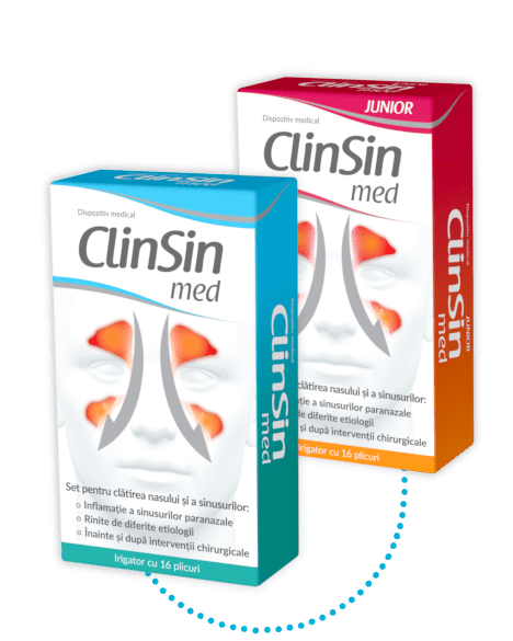 Poți reduce starea inflamatorie a sinusurilor clătind cavitatea nazală și sinusurile cu dispozitivul medical ClinSin® med – set pentru clătirea nasului și a sinusurilor paranazale. Setul conține un irigator cu aplicator ergonomic și 16 plicuri cu pulbere de clorură de sodiu, din care se pot prepara soluții izotonice sau hipertonice.
